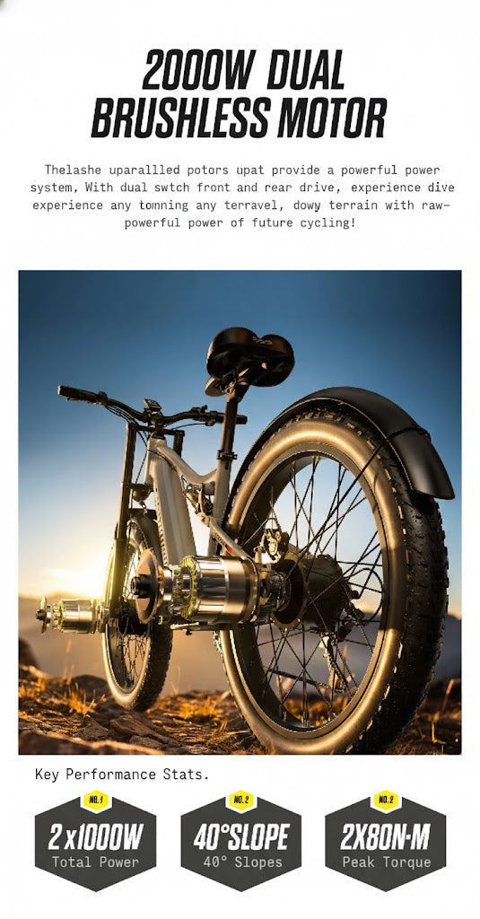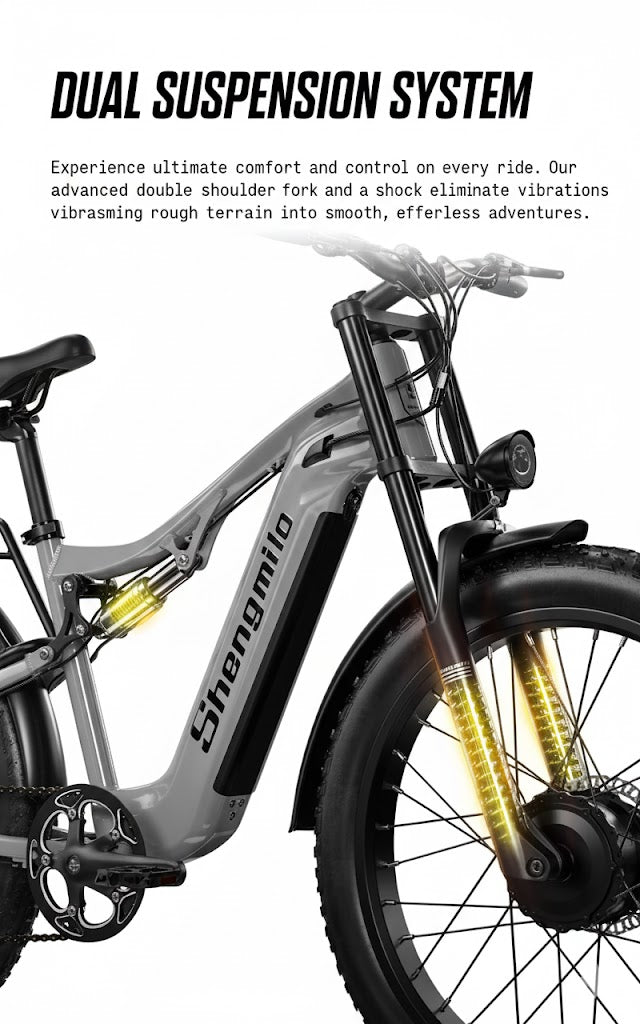 The S600 is the ultimate multi-tool for mobility. Effortlessly handle your daily commute, power through tough terrain for leisure rides, and rely on its stability for work errands or deliveries. With dual-motor power and all-terrain fat tires, this e-bike removes the barriers to cycling, making every journey accessible, practical, and fun.